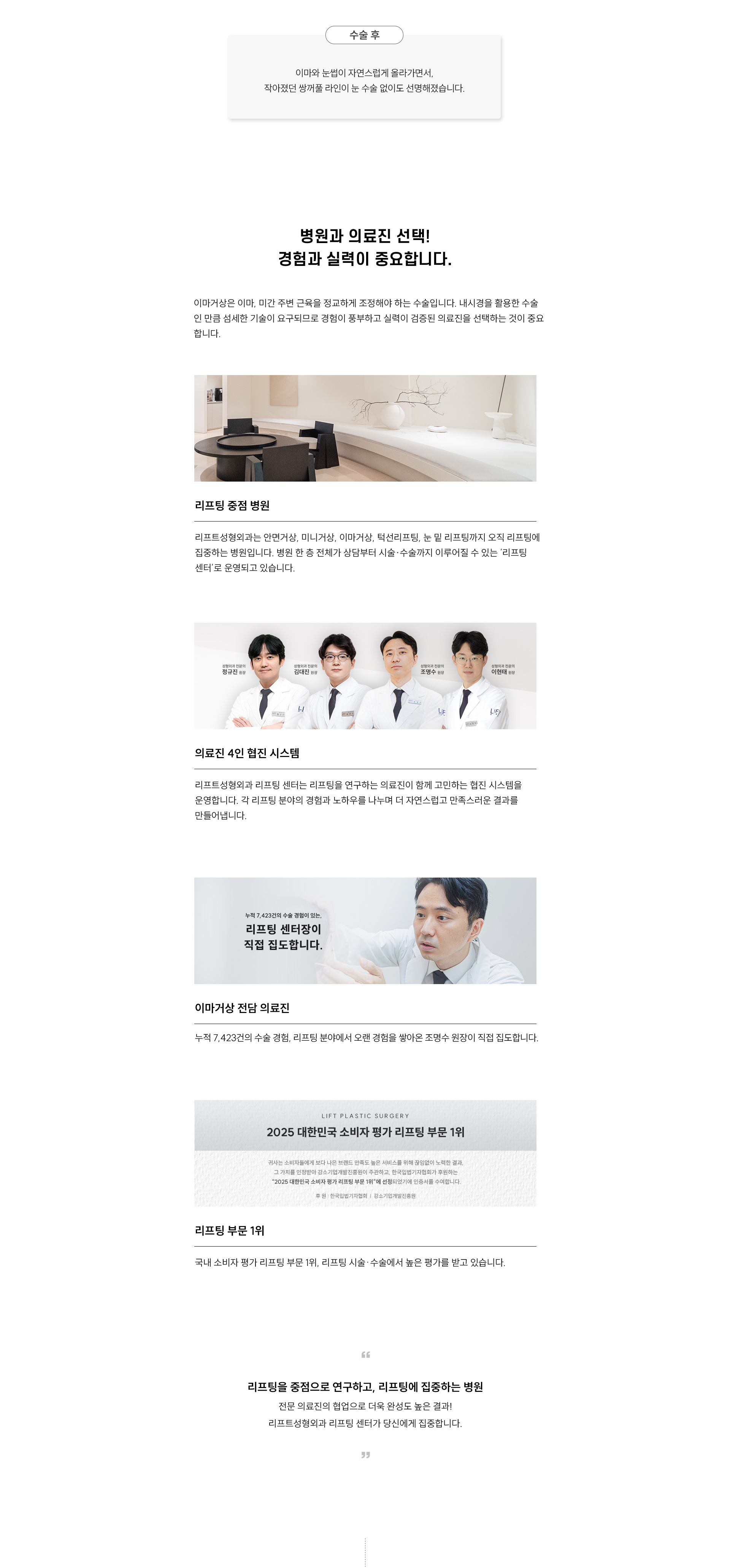 성형 수술 및 시술은 환자 개인에 따라 효과가 다를수 있으며 출혈, 감염등의 부작용이 발생할 수 있습니다.
